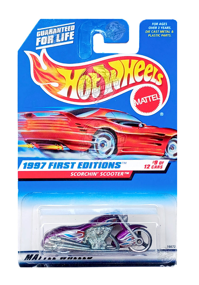 EXCLUSIVES Hot Wheels 1997 First Editions Scorchin' Scooter - Purple / Silver - 1997 Card (Card - 2) (With Protector Case)
