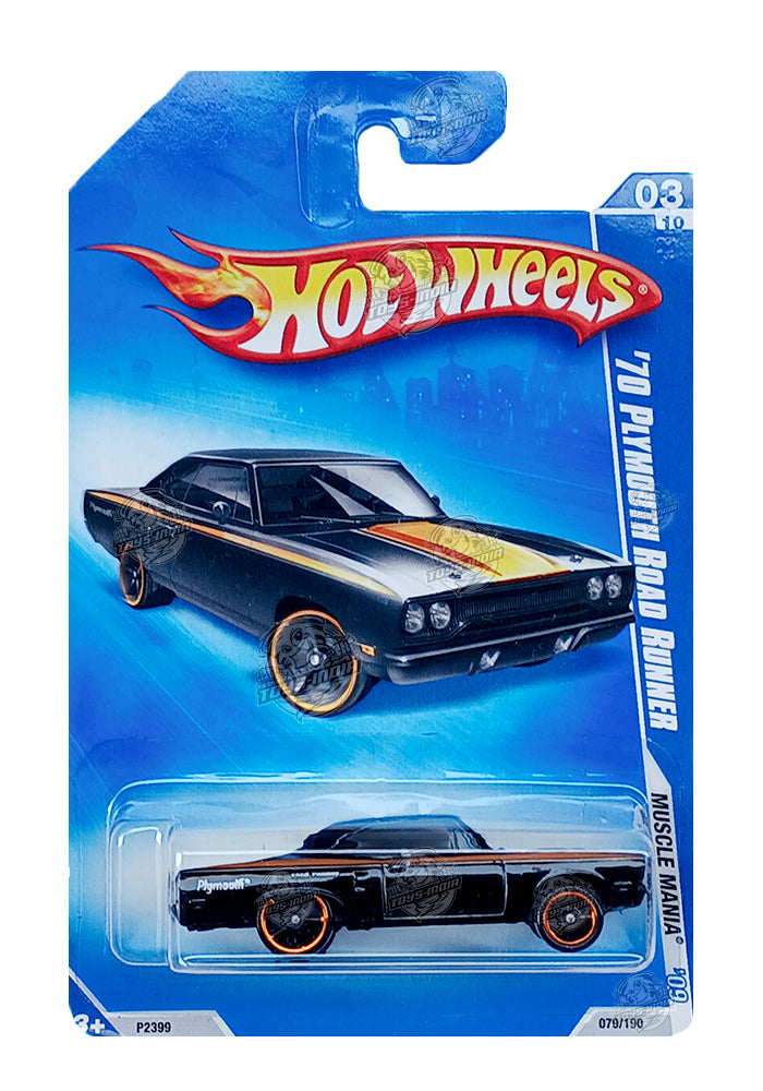 EXCLUSIVES Hot Wheels Muscle Mania '70 Plymouth Road Runner - Black / Orange - 2008 Card (With Protector Case)