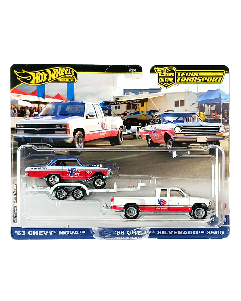 EXCLUSIVES Hot Wheels Premium Team Transport '63 Chevy Nova & '88 Chevy Silverado 3500 - Blue / Red / White - 2024 Card