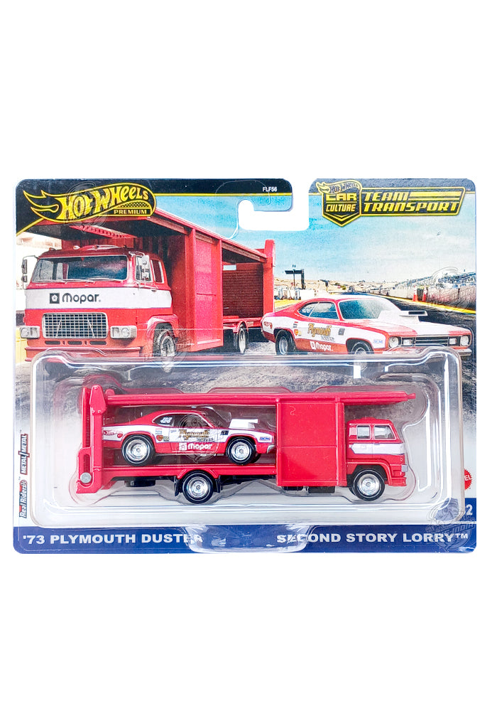 EXCLUSIVES Hot Wheels Premium Team Transport '73 Plymouth Duster & Second Story Lorry (Red / White) - 2025 Card