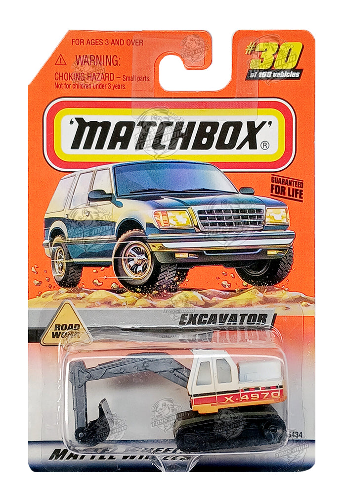 EXCLUSIVES Matchbox Construction Excavator - White / Grey - 1998 Card (Blister Damage / Car in Excellent Condition) (With Protector Case)