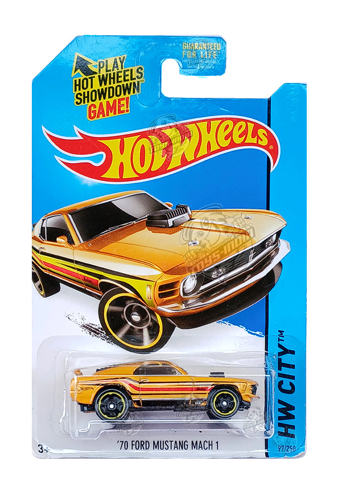 EXCLUSIVES Hot Wheels '70 Ford Mustang Mach 1 - Yellow - 2013 Card (With Protector Case)