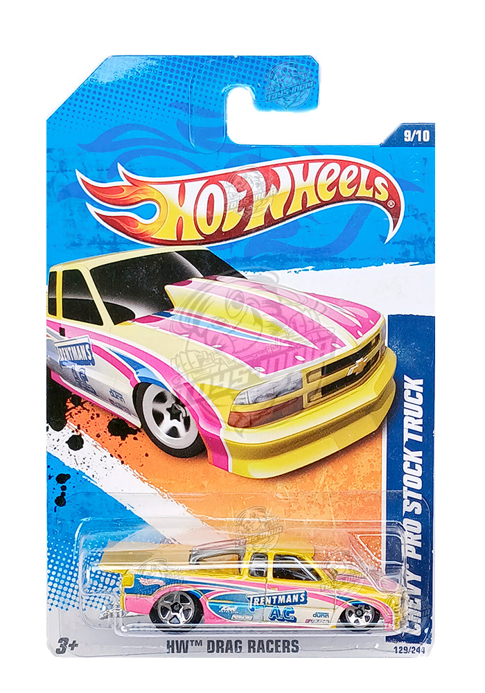 EXCLUSIVES Hot Wheels Chevy Pro Stock Truck - Yellow / Pink - 2010 Card (With Protector Case)