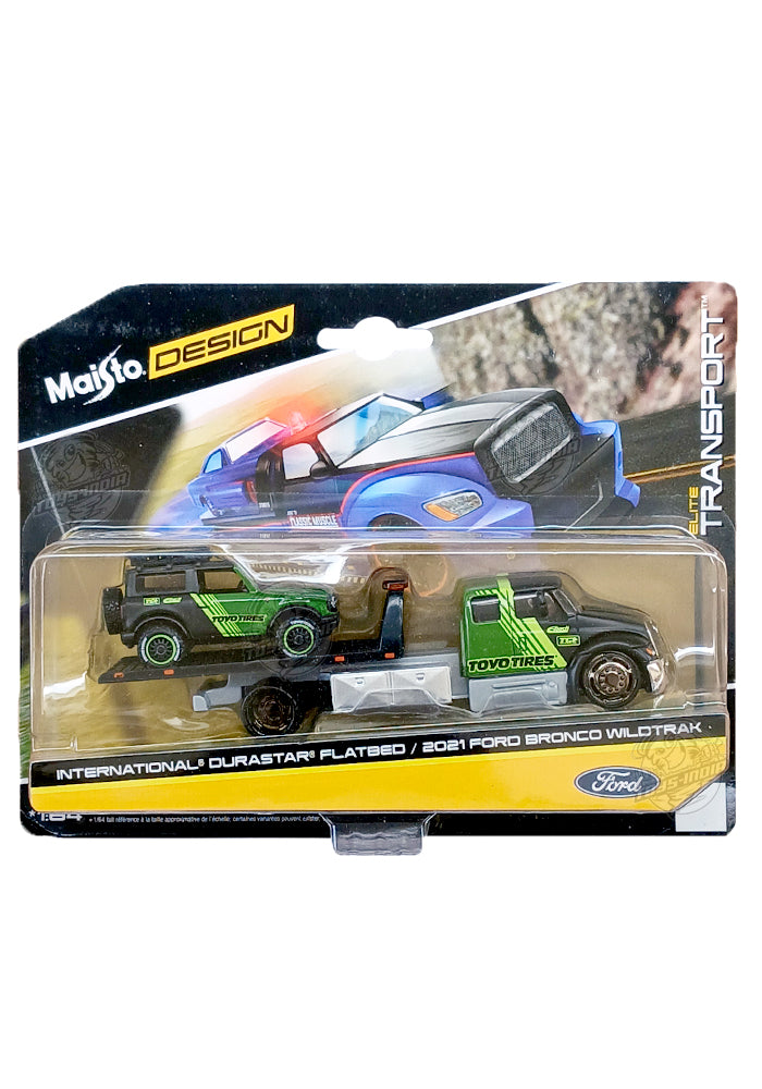 Maisto Design Elite Transport International Durastar Flatbed & 2021 Ford Bronco Wildtrak - Green / Black (1:64 Scale)