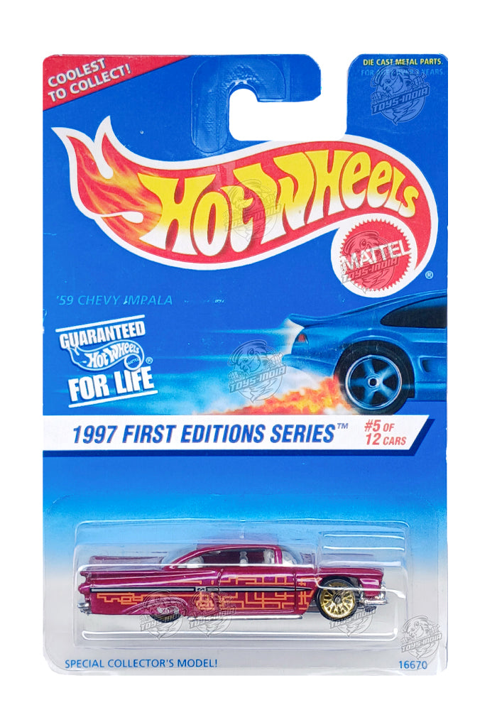EXCLUSIVES Hot Wheels 1997 First Editions '59 Chevy Impala - Pink - 1996 Card (With Protector Case)