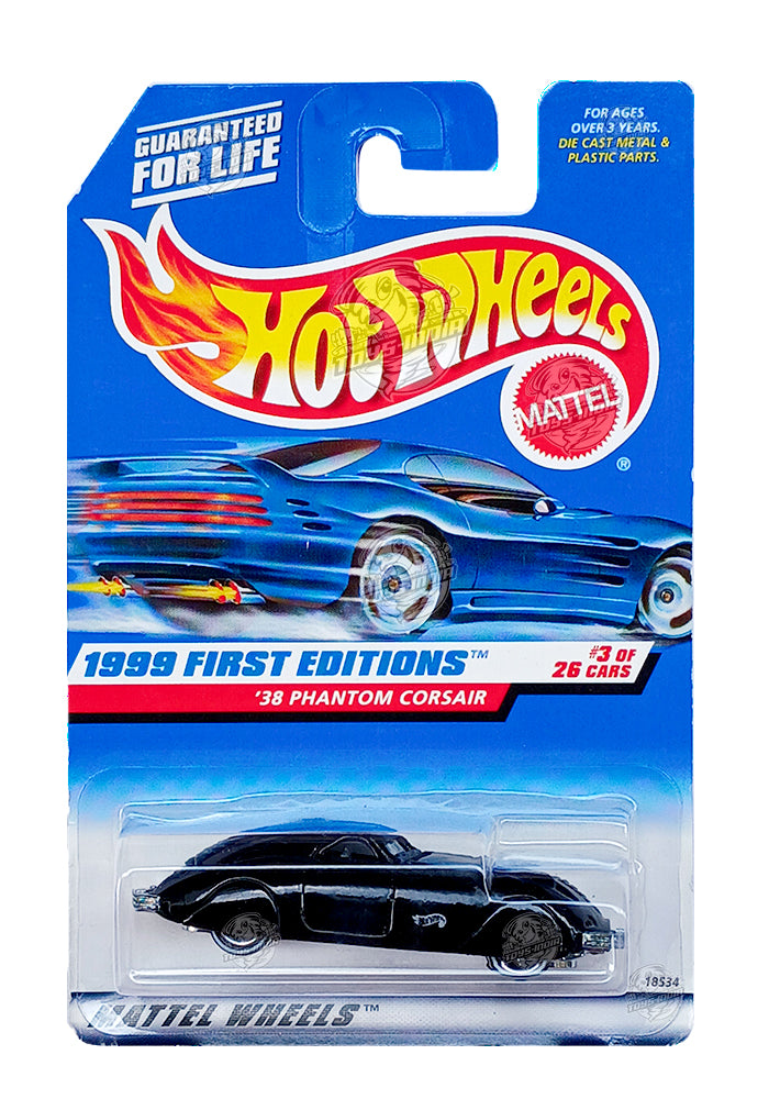 EXCLUSIVES Hot Wheels 1999 First Editions '38 Phantom Corsair - Black - 1998 Card (With Protector Case)