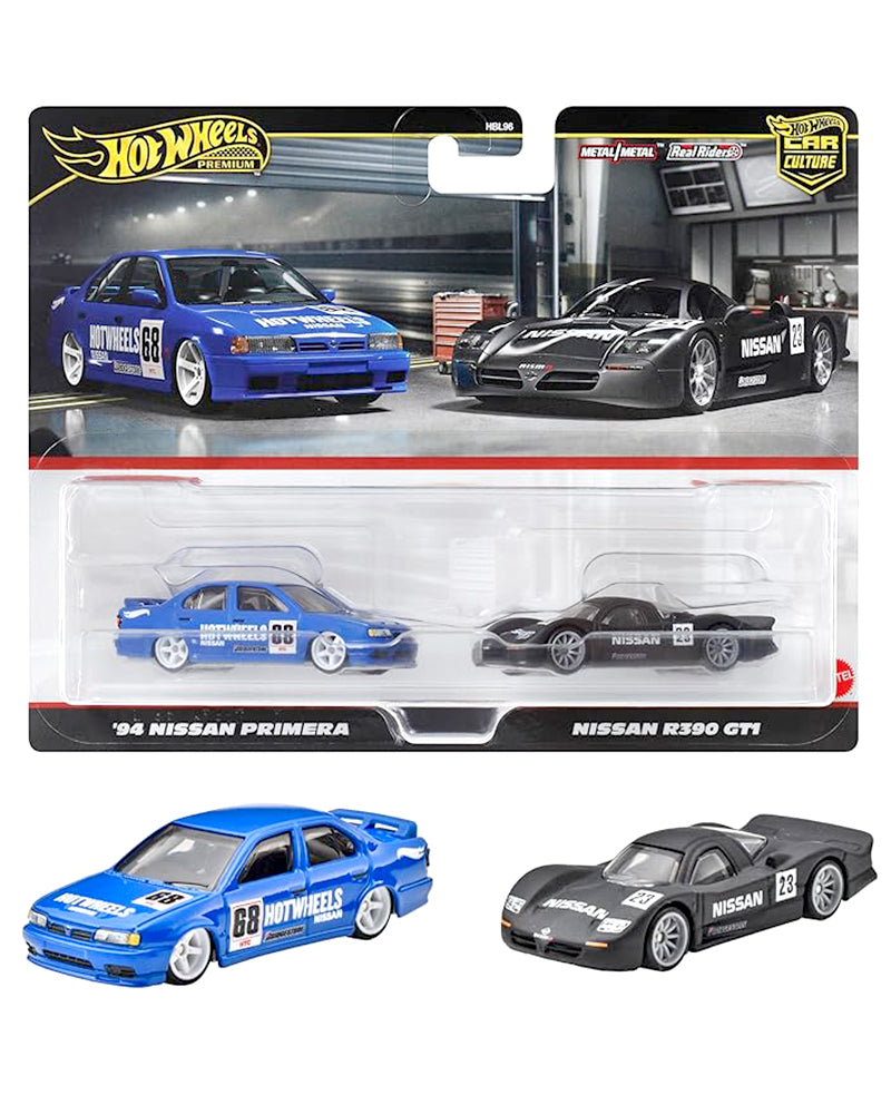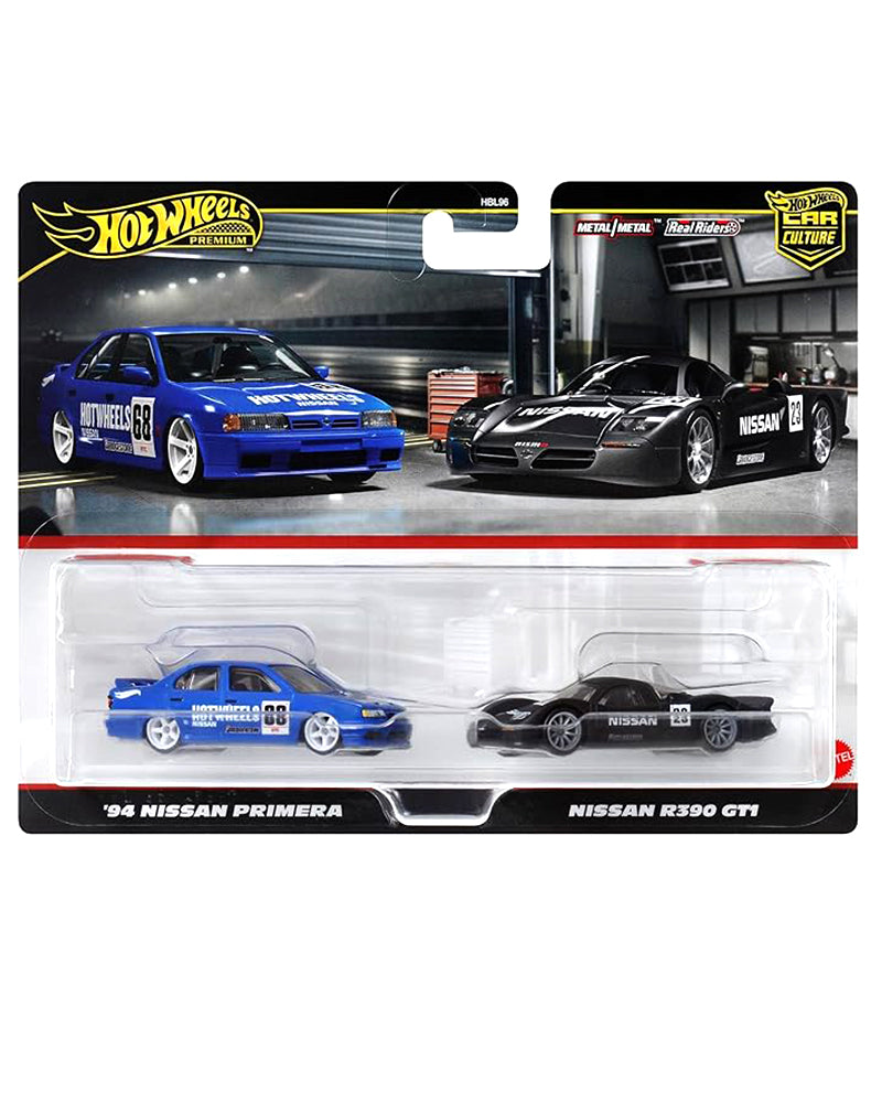 EXCLUSIVES Hot Wheels '94 Nissan Primera (Blue) & Nissan R390 GT1 (Black) - (2 Pack) - 2024 Card