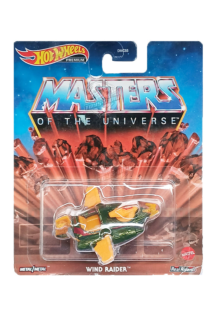 EXCLUSIVES Hot Wheels Maters of the Universe Wind Raider - Green / Orange - 2020 Card (Blister Damage / Car in Excellent Condition) (With Protector Case)