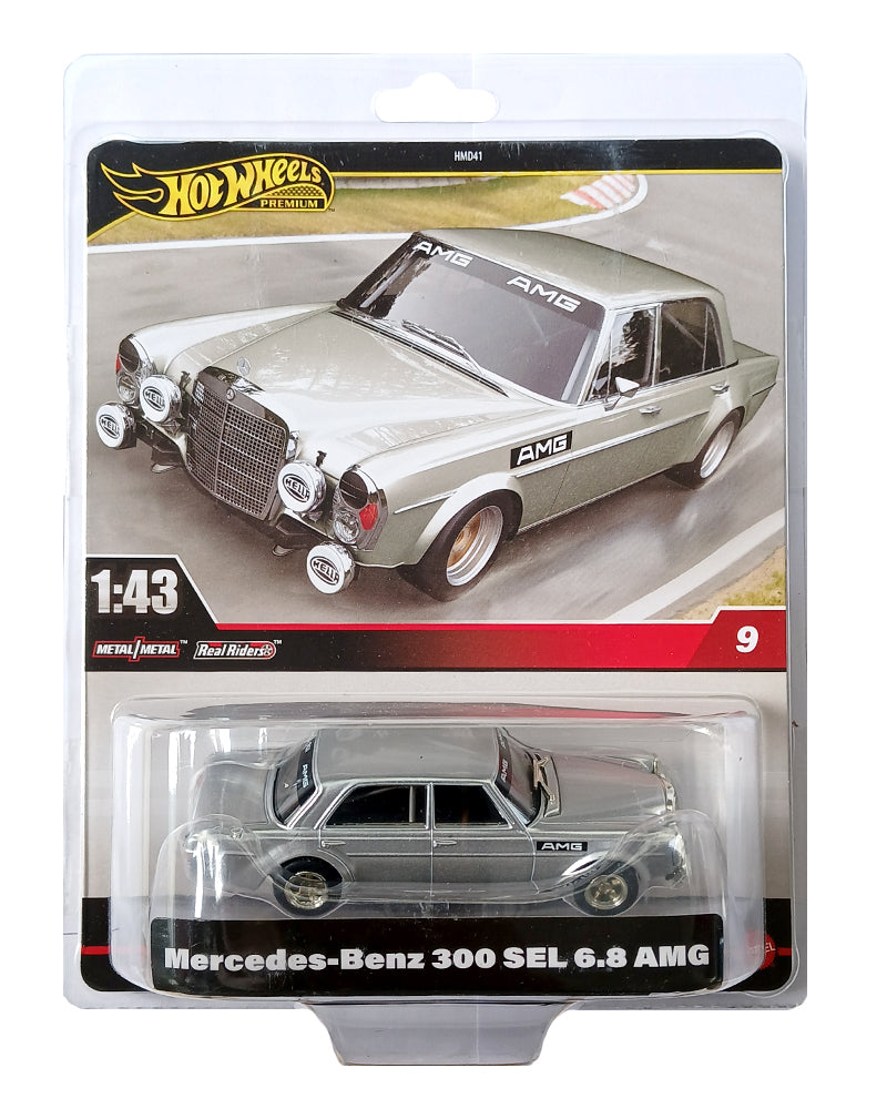 EXCLUSIVES Hot Wheels Premium Mercedes-Benz 300 SEL 6.8 AMG - Silver - 2023 Card (Scale 1:43) (With Protector Case)