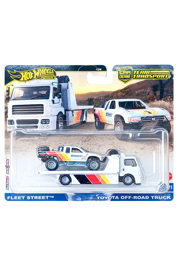EXCLUSIVES Hot Wheels Premium Team Transport Fleet Street & Toyota Off-Road Truck (White / Black) - 2024 Card