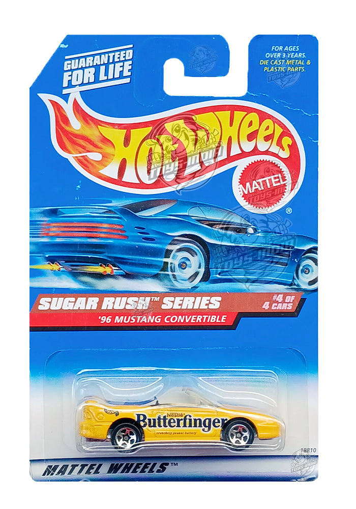 EXCLUSIVES Hot Wheels Sugar Rush Series Butterfinger '96 Mustang Convertible - Yellow / Black - 1997 Card (Creased Card / Car in Excellent Condition) (With Protector Case)