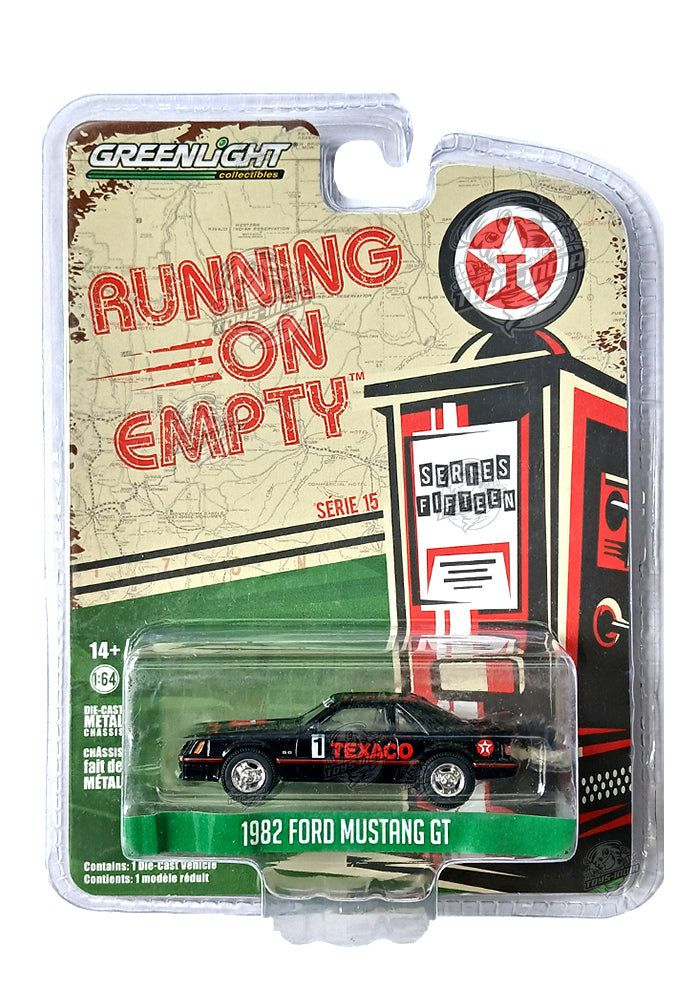 EXCLUSIVES Greenlight Collectibles Running On Empty Texaco 1982 Ford Mustang GT - Black (Scale 1:64)