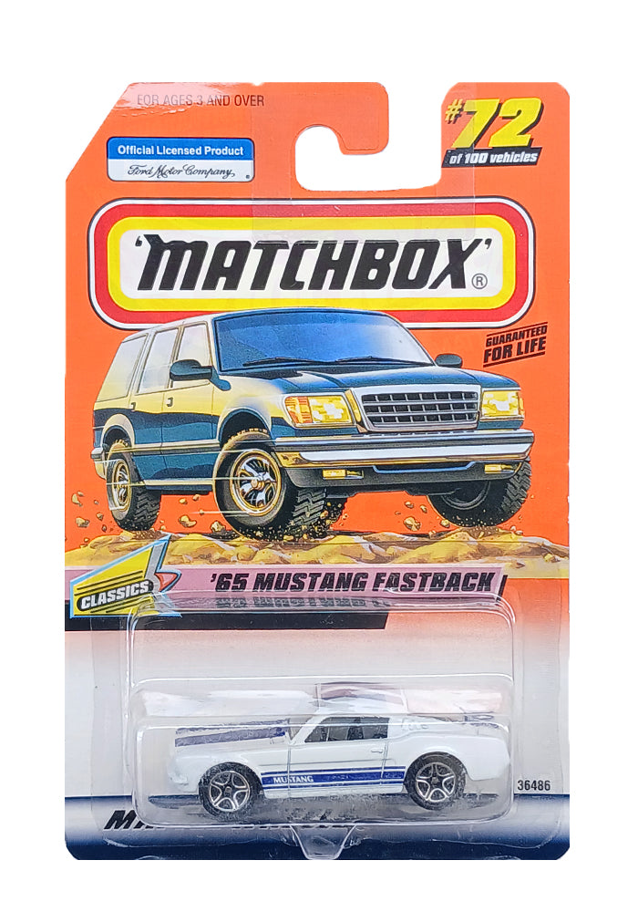 EXCLUSIVES Matchbox '65 Mustang Fastback - White / Blue - 1998 Card (Creased Card / Car in Excellent Condition) (With Protector Case)