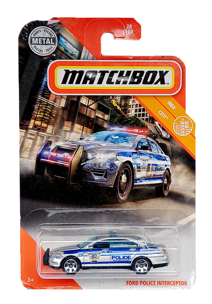 EXCLUSIVES Matchbox Ford Police Interceptor - Silver / Blue - 2019 Card (Creased Card / Car in Excellent Condition) (With Protector Case)