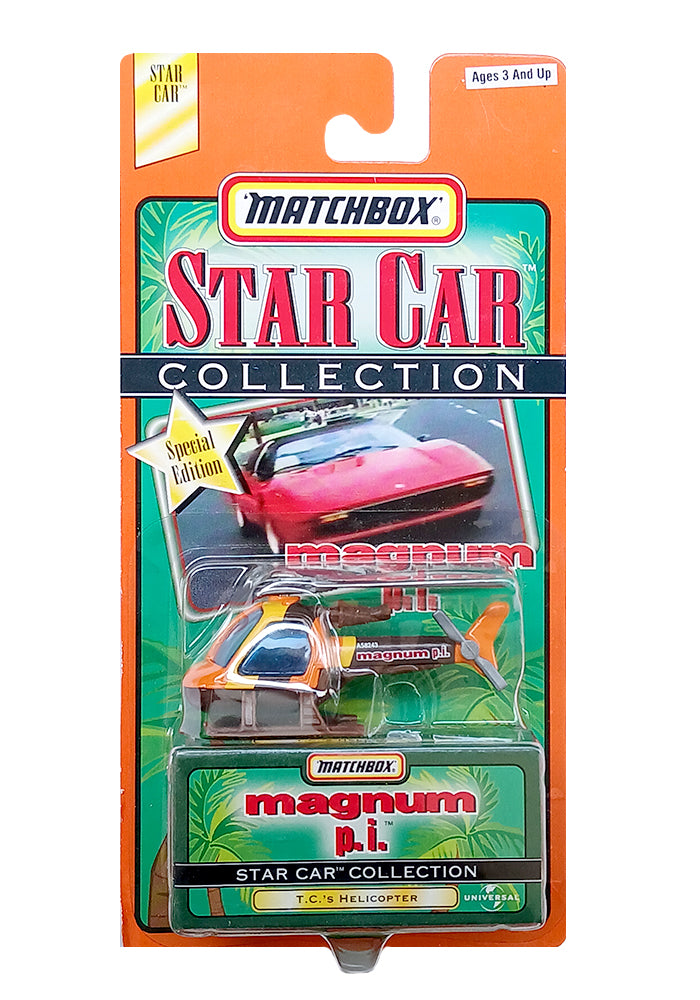 EXCLUSIVES Matchbox Star Car Collection Magnum P. I. Helicopter - Orange / Brown - 1998 Card