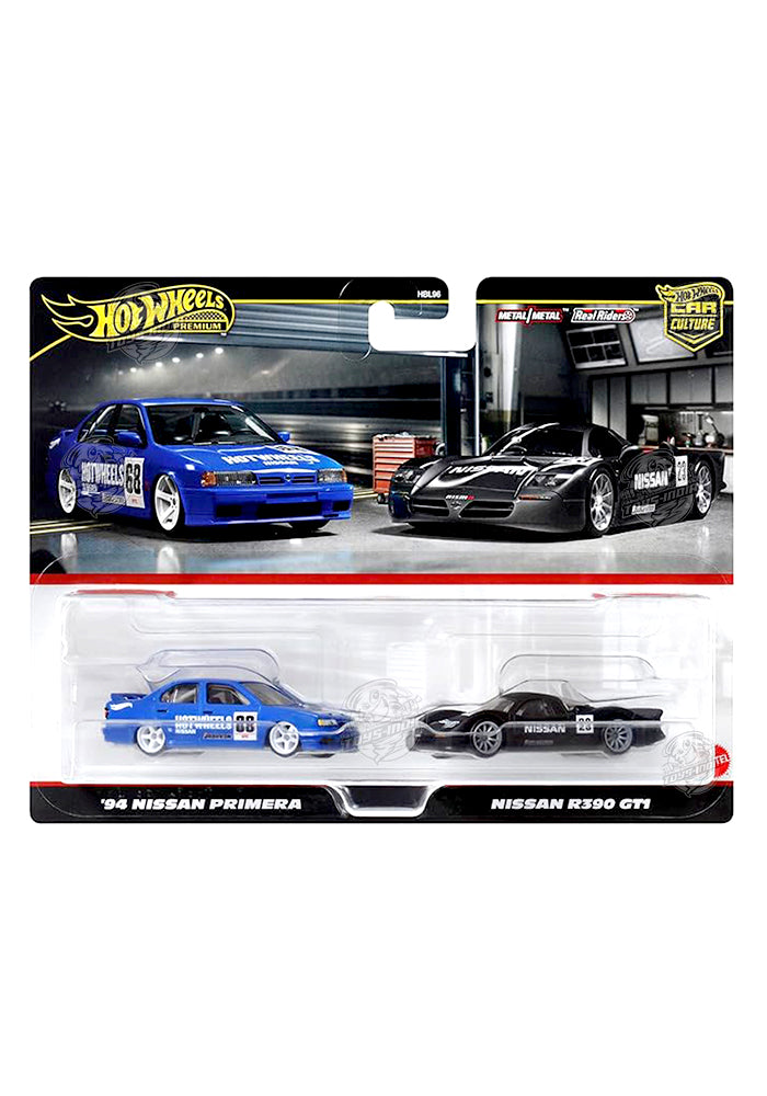 EXCLUSIVES Hot Wheels '94 Nissan Primera (Blue) & Nissan R390 GT1 (Black) - (2 Pack) - 2024 Card