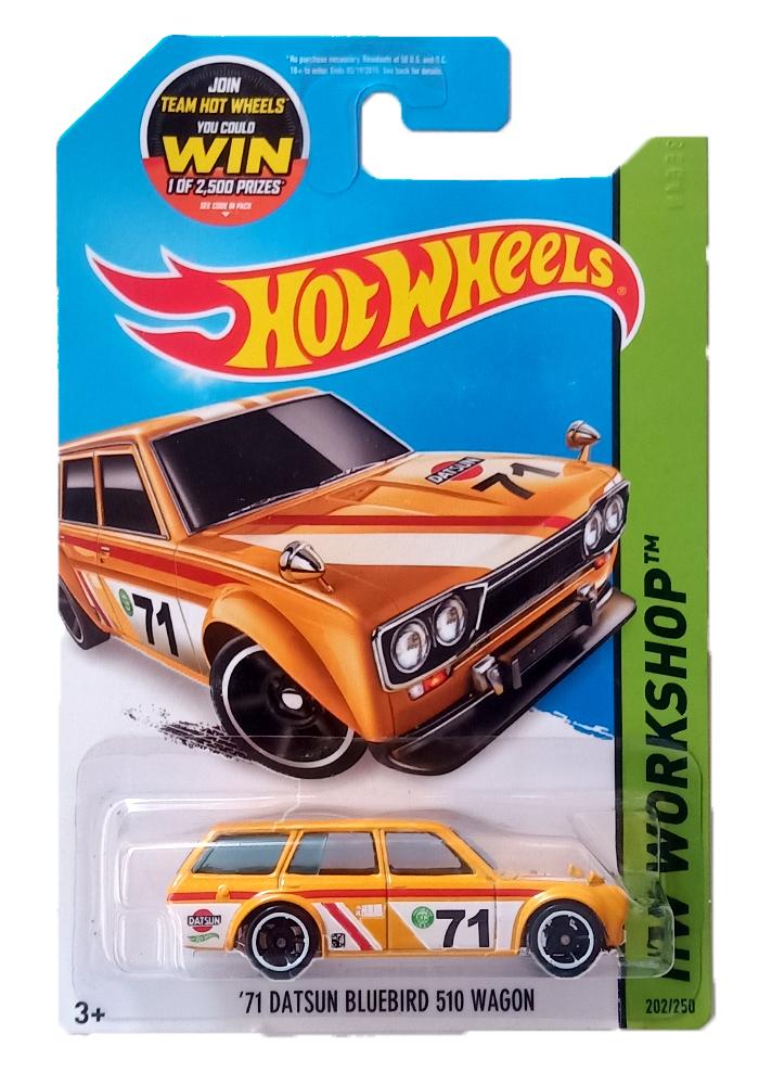 EXCLUSIVES Hot Wheels '71 Datsun Bluebird 510 Wagon - Yellow / White - 2013 Card (With Protector Case)