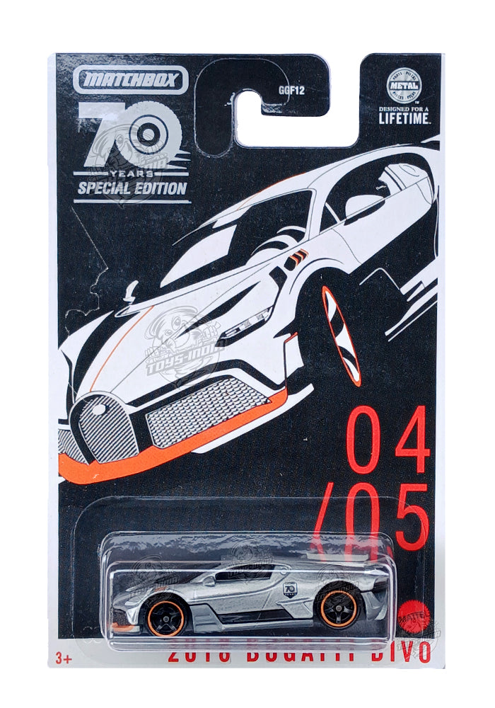 EXCLUSIVES Matchbox 2018 Bugatti Divo - Grey / Orange - 2022 Card (With Protector Case)