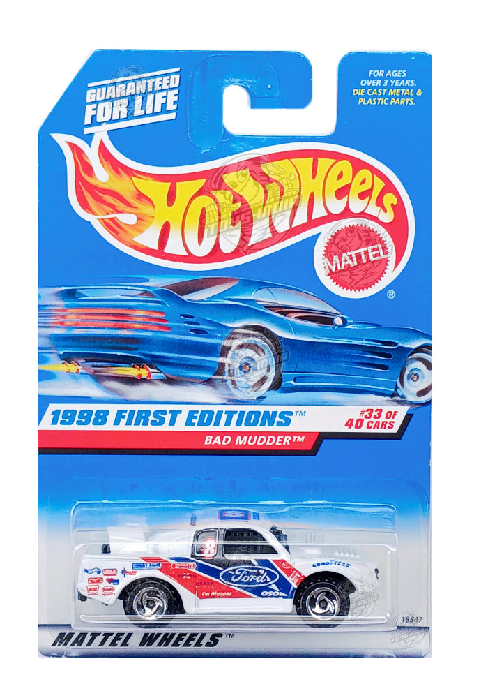 EXCLUSIVES Hot Wheels 1998 First Editions Bad Mudder - White / Blue - 1997 Card (With Protector Case)