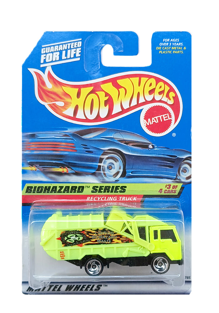 EXCLUSIVES Hot Wheels Biohazard Series Recycling Truck - Yellow - 1997 Card (With Protector Case)