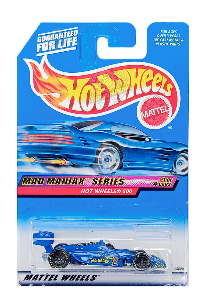 EXCLUSIVES Hot Wheels Mad Maniax Series Hot Wheels 500 - Blue - 1999 Card (With Protector Case)