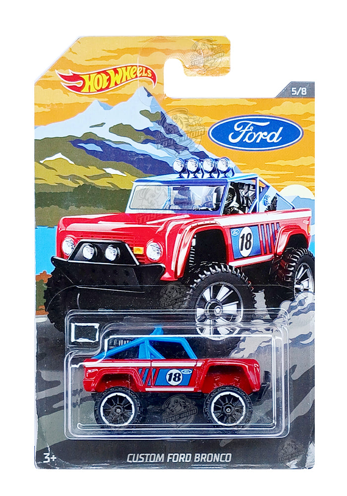 EXCLUSIVES Hot Wheels Premium Custom Ford Bronco - Red / Blue - 2018 Card (With Protector Case)