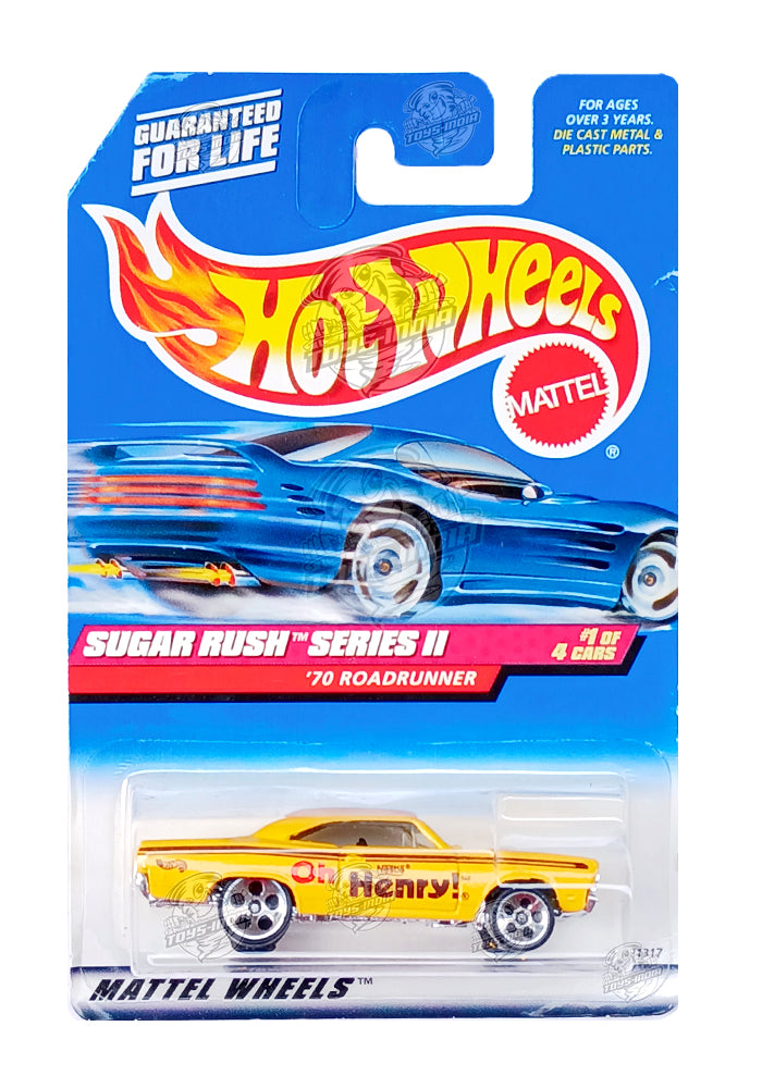 EXCLUSIVES Hot Wheels Sugar Rush Series II '70 Roadrunner - Yellow - 1998 Card (With Protector Case)