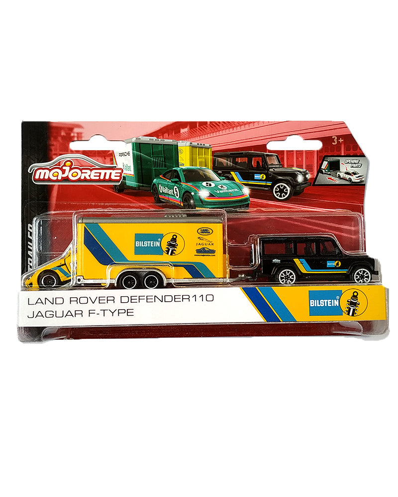 Majorette Race Trailer Bilstein Land Rover Defender 110 / Jaguar F-Type & Trailer - Yellow / Black - 2025 Card